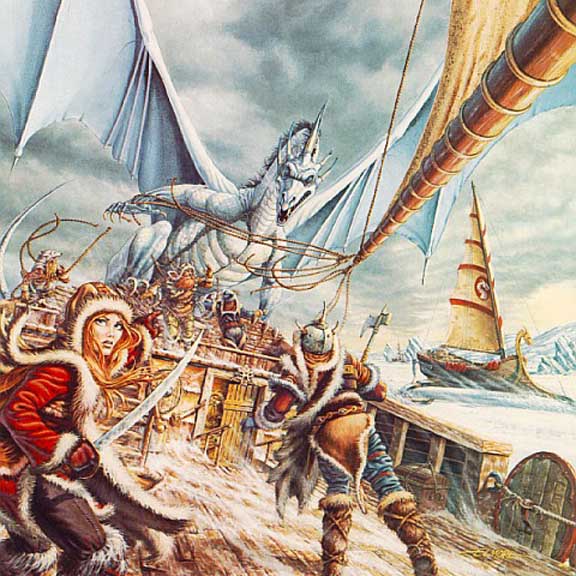 The white dragon Sleet attacking some of the Companions on their way to Sancrist |