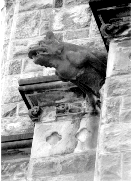 gar�goyle \'g�r-,goil\ n [ME gargoyl, fr. MF gargoyille; akin to MF gargoyiller] 1 a : a spout in the form of a grotesque human or animal figure projecting from a roof gutter to throw rainwater clear of a building b : a grotesquely carved figure 2 : a person with an ugly face - gar�goyled \-,goild\ adj