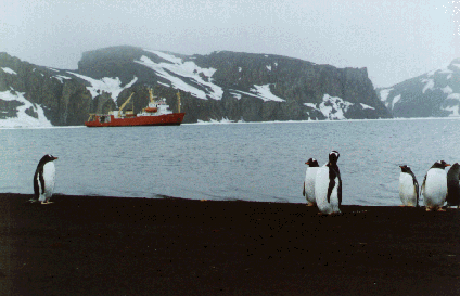 This photo of gentoo penguins was taken by Amy E.S.Schauer while serving aboard the "Polar Duke", which is pictured in the background. It was taken in 1995, and is � copyrighted by her. (Thanks for letting me use this, Amy!) Amy is finishing her education in marine biology in Oregon this year, and she loves penguins!