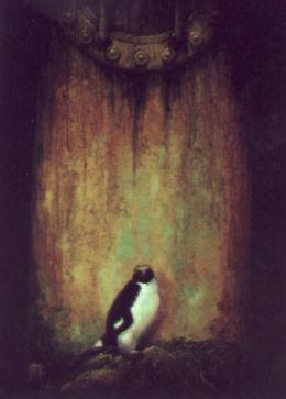 This painting is of a brave little pengi standing in front of a horrid "penguin boiler"