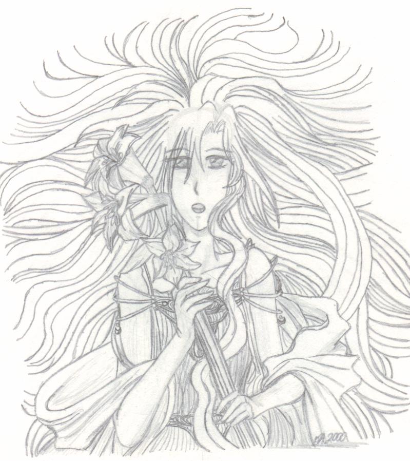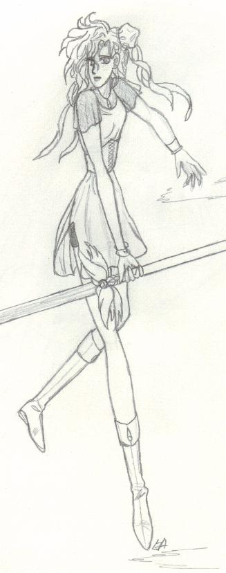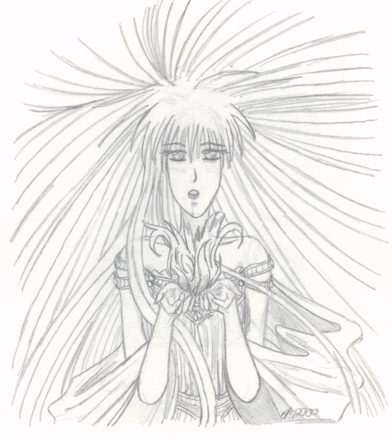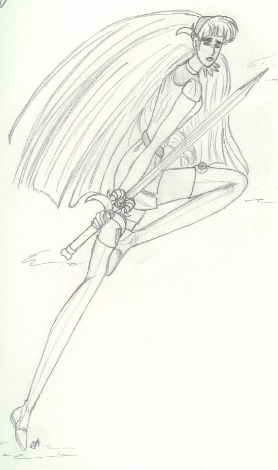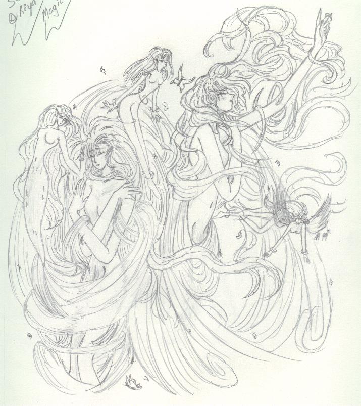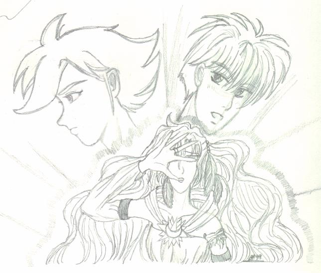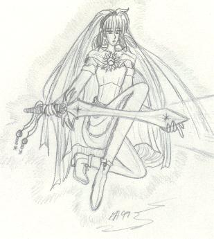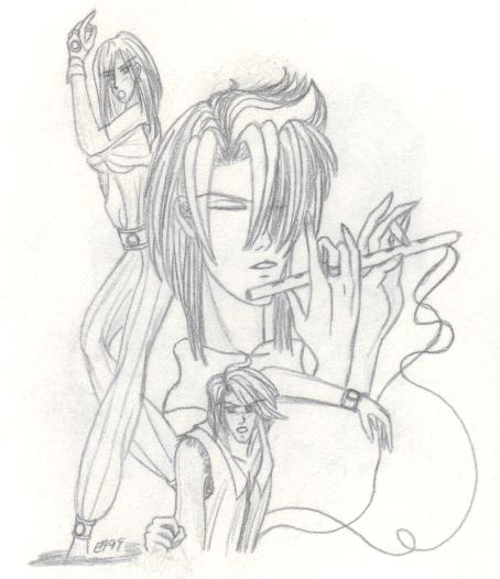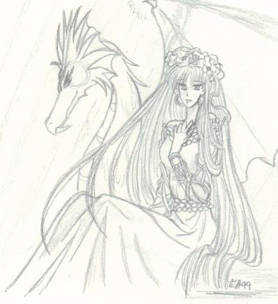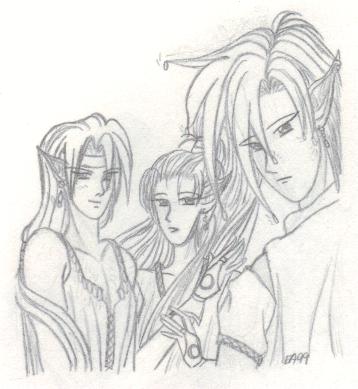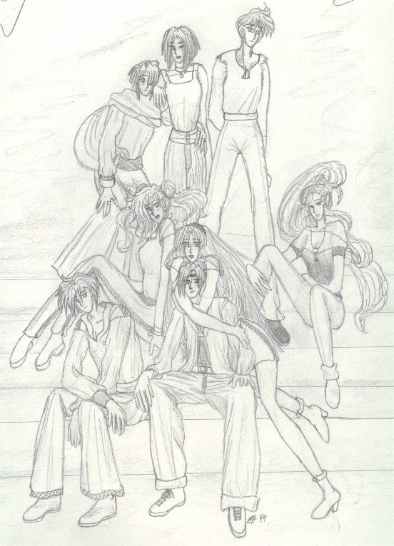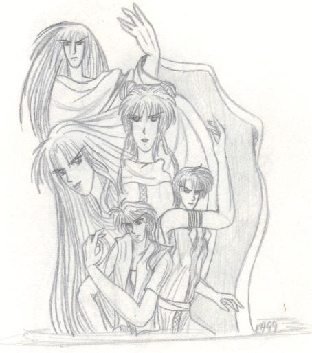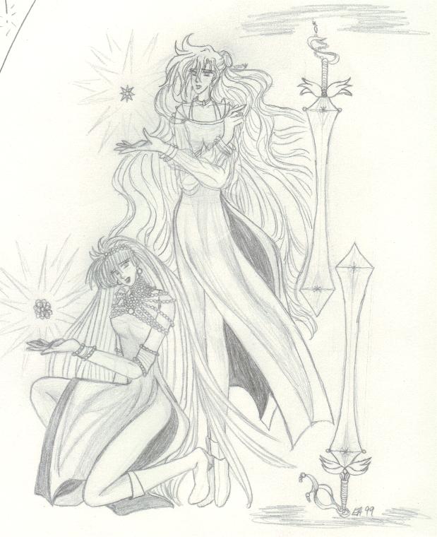 A few other key characters are not shown, such as Arrherenia, the queen of the 'mortals' of Reiyathon kingdom, and Sonnet and Kiya's numerous enemies, of whom there is a group shot somewhere in this mess. Also missing are the girls' gaurdian spirits, as well as their sword companions, Kysal and Niawynn. The girls do not know just yet that the feminine spirits trapped within their swords are actually the Ladies of Legend of the past. Sonnet's gaurdian spirit, the great dragon, Drandelithe, and Kiya's spirit, the winged unicorn Synali, are also in various pictures below.