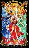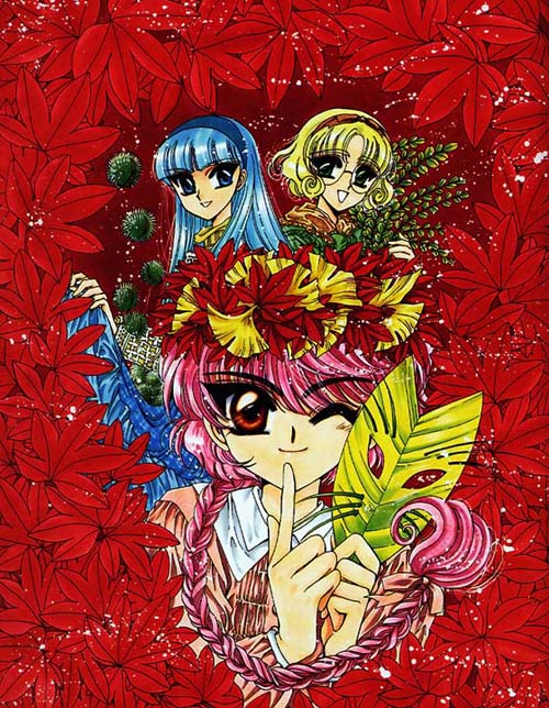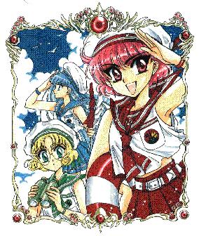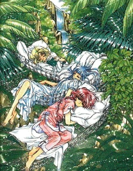 Here are the three knights themselves; Hikaru, the perky red-head and the one to call on the power of Rayearth; Umi, the snippy blue haired prep-student to call on the power of Selece; and Fuu, the calm and wise controller of the power of Windam.
