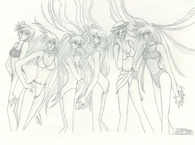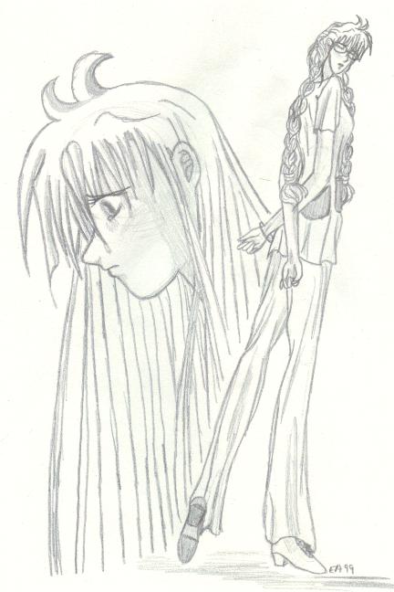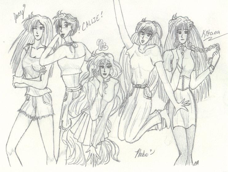 This is the best 'group shot' I have for SNM, and as you can see, it's just the gals of the crew. It's also fairly old, so all of the chars aren't there, anyway! Anyway, as for some quick bios...Jacy is the blue haired 'ice queen' of the crew; she's the hot tempered and strong willed Plutonian who unknowingly starts the crew after her planet is destroyed by mysterious attackers. Jacy is headed for Earth when she crash lands on Luna City, loosing the lives of her two friends and companions, leaving her to be the sole survivor, as far as she knows, of the disaster on Pluto. There, she meets up with perky Phebe, who is rather lonely, with her parents busy all the time, and longs to sing. They each meet Valentine, who has strange dreams about her lost family, especially her older brother, selling flowers on the road. The trio continue on to Earth together, where they meet up with Ash, Quinn, and Thierry, refugees from the civil war on the Martian surface. Snappy Ash immediately steps off on the wrong foot with Jacy, and drags his best friend, quiet, secretive Quinn, and his older brother, the work-a-holic Thierry, along with him. Before fleeing Earth, the two trios meet up with Sky and Kauri, weapon-crazed bounty hunters, of sorts...and from there the crew continues to grow. Back on Luna City, the group meets up with Gavin, a secretive young man with a knack for music, who immediately takes a shine to Phebe, and vice versa. They also meet up with Tre, who actually owns the ship which the group carts around in, and perky Tajenia, who seems to follow him around wherever he goes. It's not long before they pick up Callie, Jacy's match when it comes to being hot tempered, on an abandoned asteroid just past Mars, and soon after meet up with Kitana and Bryce, foster siblings living on the Callistonian world by Jupiter. Other chars include Saph, a strange stowaway on the ship with a very secretive past and personality, and Eva, another secretive young lady, who reaches out for help to the crew through Val's dreams.