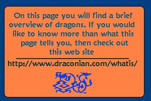 Facts: Dragons in general are warm blooded reptiles which are found in almost every culture's mythology. Dragons usually have large wings which they use to fly (duh!). A dragon's body is covered with scales. These scales act as armor and are usually extremely hard. Dragons can be classified many different ways. One of the most common ways of classifying dragons is color. Dragons come in almost any possible color. Most of the time a dragon's color reflects its abilities. For example, a red dragon typically breathes fire and a blue dragon usually breathes ice or lightning. Dragons can either be kind and benevolent or fierce fighters. Some dragons protect people while others seek to destroy them. Dragons have been known to attack countrysides or castles until they are defeated by a warrior or given a sacrifice. Typically, dragons live in caves and amass huge collections of gold and valuables. This is usually why dragons are hunted. The warrior who killed the dragon would recieve all of the dragon's riches. The dragon's life span is hard to judge. Some dragons have been known to live over 1000 years. However, none have died from old age. They usually are killed as a result of some disease or being killed by humans. Once again, if you would like to know more about dragons, just go to the web page address at the top of this page.