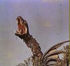 Efter nogle dage lærer Reptilicus åbenbart at bruge sine vinger! For, "Mark! Uhyret flyver!" I øvrigt er det ganske imponerende at dyret kan flyve så højt og hurtigt uden en smule basken med vingerne.