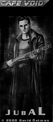 Jubal - He is a dark-haired man, age thirty to thirty-five, rather short but relatively broad across his shoulders. He is wearing a dark-brown leather jacket, reaching down to his knees, though on a closer inspection one can see it's not real leather, but the artificial kind. Underneath the jacket is a long-sleeved, gray t-shirt, tucked into a pair of black pants.