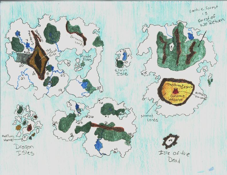 The Elvin Isle stands 5,000 feet above sea level. The shear cliffs caused by this height are impossible to scale by normal means, and magical spells won't allow you to stick to the cliffs or levitate near them. The sea around the island is constantly in a storm and impossible to sail. Living in the caves under the island's surface are the Calidairian Drow elves (which look more like normal moon elves than normal drow elves). The capital city of the Drow is called Torinos. The Drow of Calidair are not evil like the Drow of other realms. They are bitter to their elvin brothers for "condemning" them to living in the caves and patrolling for intruders, and they hate all non-elvin races, blaming them for Khaisis' crimes, but they are not inherantly evil. No non-elf has ever traveled to the Elvin Isle and lived, NO EXCEPTIONS!!!