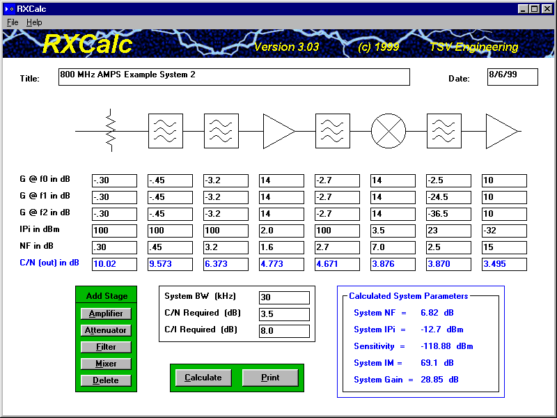 RXCalc is a receiver system block diagram simulator for general purpose receiver systems. Up to eight system blocks may