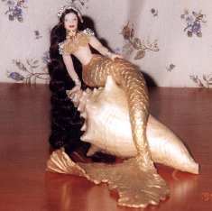 I fell in love with mermaids a long time ago. Lydia the Mermaid was specially made from my picture, by a dear friend, Shelly Norrick. The eyes are hazel golden brown rimmed by black, just like mine. Gorgeous details include breast covers made up of hundreds of golden micro-beads. The necklace and wrist adornments really complete the golden mermaid princess look. Pity you can't see it in the picture, 'coz she has the most kissable lips.