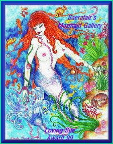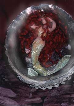 Asleep in an abalone shell, this fiery redhead mermaid has her hands up in the gorgeous curls tumbling down in waves. Her upper body and tail are covered in sexy light green lace. This is a creation of Rhonda Simms, my mermaid fairy godmother, because she grants me wishes for more mermaids. ;)