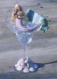 This little blonde pixie-like mermaid is another creation of Shelly Norricks. She has a pink and green tail. She sits inside a margarita glass filled with glass beads. The base of her glass is decorated with pretty sea shells. I just love the starfish necklace. Notice the details on the green fin and how the fin is flicked over the glass.