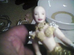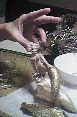 While putting the finishing touches to Lydia the Mermaid, Shelly has this great idea of putting a headpiece on the mermaid, instead of the usual bareheaded look, or the flowers and shells. Here she puts on the headpiece on Lydia the Mermaid, just to show me how the mermaid would look wearing the headpiece. Of course she promises me that Lydia will have hair when she's done! :))