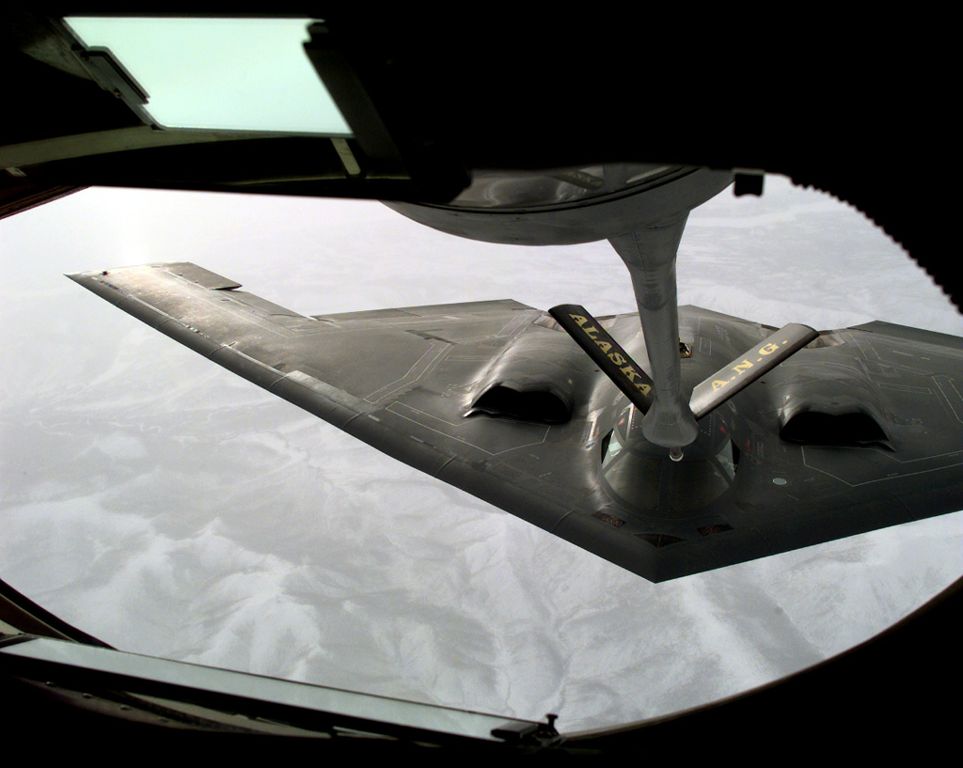 Size: (67 KB) Type: JPEG Comment: B-2A Spirit bomber and a KC-135R Stratotanker rendezvous over Alaska. |