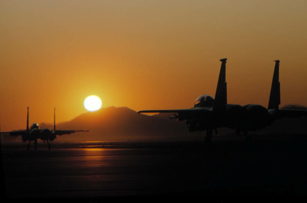 Size: (26 KB) Type: JPEG Comment: Two F-15E Strike Eagles taxi at sunset |