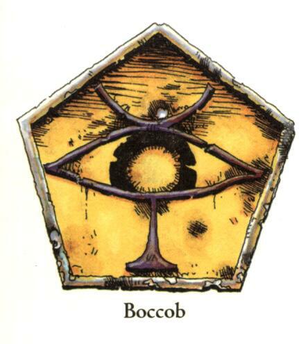 Boccob is portrayed as an old man with bright, intense eyes, clad in garments