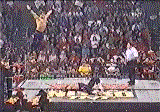 TONY ROSS: "What is Sage going to do now? He runs back to the ropes and waits for Kerrigan to get to his feet on the floor! Kerrigan is doubled over and now stands up and here comes Sage!! Sage runs, leaps on the top rope, bounces off that and does a split-legged moonsault onto Kerrigan!! My God, what a move!! The Kiel Center is going to lose it's roof here!! Kerrigan never knew what hit him!!