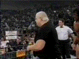 T.R.: "Noo!!! He's going to lick the whipped cream off of Rabesque!! Cut the cameras!! How could the FWF allow this to go on!! Oh, thank God! The Mercenaries are here! Jonathan Nash and Rob Anthony hit the ring and Michaels is up and out of there!! He hightails it to the dressing room!"