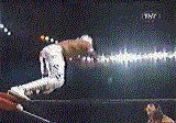 (Hacker leaves and walks down the aisle. As he walks to the back Conflict jumps out of the crowd dressed as a fan. He attacks Hacker. Hacker lays hurt as Conflict runs off.)