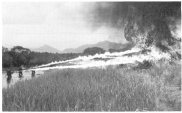 When used, the flamethrower sprays burning napalm over an area 5 metres across, the wide spread makes it easier to hit targets thus getting a +4 hit bonus. The fire burns for 3 rounds, doing 6d6 hp in the first round, 4d6 in round 2 and 2d6 in round three. Only personnel with a Strength of 16+ can carry a flamethrower. Should the flamethrower tanks themselves be hit, the resulting explosion deluges napalm in a radius of 20 metres, doing standard flamethrower damage.