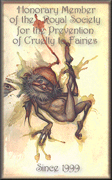 I am Tytanea and it is my greatest pleasure to welcome you here to my home... Please treat it and any you may find here with respect and consideration. I share my life with you in the hope that it may bring you peace and joy. Or if this is something a little different for you, at least it may bring a bright spot to your day. Anything I can do to lift your burdens would be my dearest joy! So stay a while here in UnderHill and don't worry what time may pass beyond our doorway... There are many interesting places to get to from here... I have included links to a few of them. I hope that you enjoy them as mcuh as I!! As you can see, I am an honorary member of the Royal Society for the Prevention of Cruelty to Fairies... As soon as I get back to the site and fill out the proper forms, I hope to be an official member!! If you are at all interested in fairies and such, definitely go and check out the work of Brian and Wendy Froud... It is amazing!!