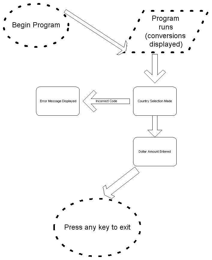 Final Project: Click on this link to see the sample program Final project was a sample currency conversion program with supporting documentation: Version Control Sheet Dennis Blevins My program started as the base needs of the requirements. I had a basic display for the currency rates. The progression to the calculation portion led me many directions. My first try was to use an Array and have the program call to the Array for the different calculations it needed. My lack of experience showed when I ran into problems that I could not solve at this time. I went to basic if else statements to input the calculations and allow for an error message to be displayed when the wrong choice was picked. I also used a character select command to make the choice from a list of options. My final program had me declare the variables for the currency rates and declare a variable for dollar amount input. Originally I had a toupper command when I used letters to identify the choices and forgot to change that to a simple if when I changed it to numbers