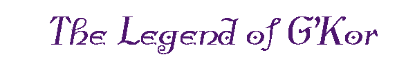 The plan was quite simple, to G'Kor: he would find the gods and show them that he should be a god, too. You see, very simple. To achieve this goal G'Kor knew he would have to hone his skills to their finest degree, he would have to become even better than he was. He had an extensive collection of weapons and armor and had learned how to use all of them with great skill, surprising and astonishing all of his teachers. He set about getting more battle experience. He needed to be ready to fight the gods, in whatever form they took.