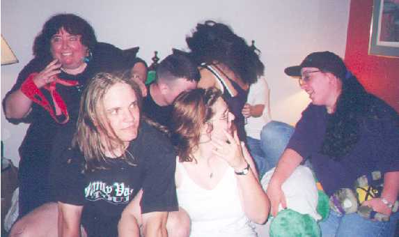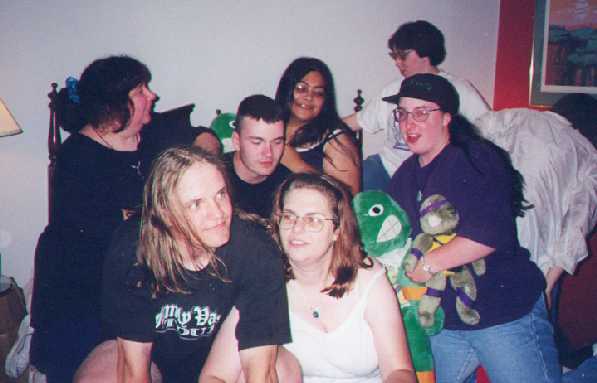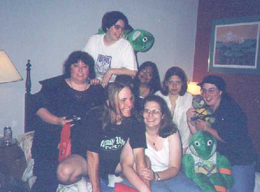 I don't know how many shots of us all on that bed were taken. I may have more attempts on my 2nd camera, plus there were at least 3, maybe 4, other cameras on the go. The mask I'm holding got put to use later. How, you ask? Well, after this photo session, I took off for my room, to remove my eyeballs (or remove my contact lenses), and while I was in my room, I was possessed by an evil presence! Yes, those that have been to the Dalnet channel #TMNT have met her, and now she appeared in person...DiscoRaphCindyBrady invaded the party! She had been slowly infiltrating, if you look at the above photos, you'll see the flashy pony tail holder and the blue disco ball earring. Well, when I returned, the hair was doing the Cindy Brady pigtails, had the mask on and was dancing to music only I could hear. Oh, yeah, I wath talking like Thindy doeth thometimeth, too. (no offense intended to those with speech impediments). Essentially, the rest of the night was spent eating cake, watching the rest of the TMNT anime, drinking pop...and then Don dragged out that HORRIBLE "We Wish You A Turtle Christmas". Heinous!!