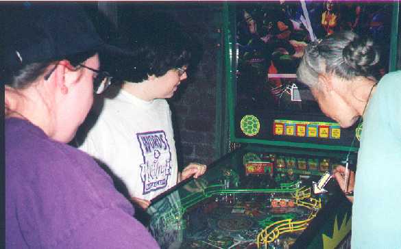 In the meantime, the rest of us passed the time with pinball and the arcade game. This particular shot is actually kinda funny, 'cause TN managed a shot that surprised us. Look closely at the pic, and you can see the yellow ramp on the right side of the game (by Scratch's Mom). Normally, the balls roll down this ramp (and the green one on the left, by Don). TN managed to flip a ball up onto the ramp, and got it stuck off the side of the ramp (the arrow is pointing at it). No matter how hard we tried, we could NOT get that thing loose...until Seven hip checked the machine <G>.