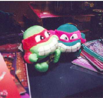 Ok, just so you don't think everything at Mirage was either TMNT or weird/morbid skulls (no that representation comes from the warped mind of the individual doing up this page <G>), there was one other thing in this room that was just so incredibly kyoot, we all had to snap pictures of it. These stuffed TMNT came from Japan. In case you're wondering, this is Mike and Don. We found Leo in another room...don't know where Raph was (and I believe there was a Splinter in the series, too, but we didn't see that'n either).