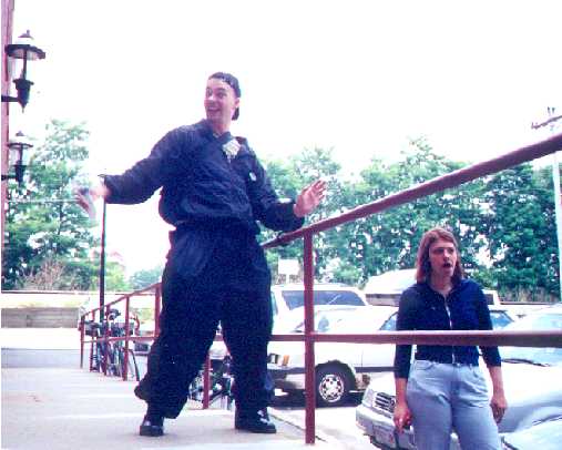 | Leo prepares to remove his belt, as he loses a round of Strip Poker (Mike's already lost his mask <G>) |
