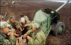Artilery crew sitting down to eat