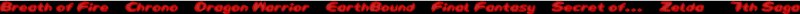 Welcome to RPGTOMB! This page has been designed by the wonderful staff based on Role Playing Games we have played over the years. Each staffer has done the work on a designated game that they have beaten a few times so they can give full, unbiased reviews on the game aswell as full walkthrus, information on the game, characters and some spiffy MP3s that come fromthe game for you to download...FREE!! (yeah us!). Now the story behind these lovely little images beside the posts (like the one beside this post). Well, if you turn your attention to the right of this post, you will see animated pictures of RPG characters with names beside them. Those are the sprites that each staffer has chosen to use as a sig. Now instead of typing our names in, we can add the sprite beside each update and you will know who did it. Anyway, you can read the other staffers updates if there are any. Otherwise, navigate through the site to the different sections by using the words bellow the banner, or the links to the left will take you to each individual game we did. Enjoy! |