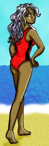 Appearance: Once one's eyes get past the exceptional top-heaviness of her frame to her actual features, the beauty of her hybrid genetics flowers. Her mixed heritage has given her a lovely midtone bronze coloration and pale gray eyes. Anime convention has given her legs to die for, and oddly colored hair, in this case an opalescent blend of white, pink, and pastel blue. In her Senshi identity, her hair is caught in a toptail, while it cascades free in her civilian identity. She has an eclectic taste in clothes, and will wear any style if the mood strikes her, but she is partial to silks. She also has a large collection of t-shirts with supposedly clever phrases on them.