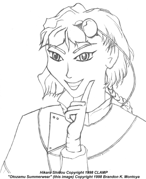 Pencils : Just me Inks : Just me Colors : Just me Medium : Plain paper Characters : Umi, Hikaru and Fuu Pencils and inks for Umi and Fuu were completed on 11/28/1998, Hikaru's pencils were 3/10/1999 with inks on 3/11/1999, all three were colored with prizmacolor on 2/29/2000. As always, the artwork to