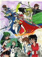 From the Gundam Wing series, Duo Maxwell is the pilot of the Gundam Deathscythe H. Perhaps a bit ironic, as Duo is the most optomistic and cheerful of the five Gundam pilots. Yet he is a monster in battle, making short work of his foes with his deadly beam-scythe. In Cephiro, Duo proves that he is just as capable of controlling a Mashin as well as a Gundam. Art completed around 10/14/98. |