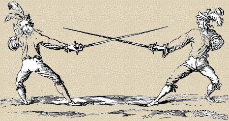 Typical weapons for fencing include rapier for one or both hands, rapier and main-gauche (or left-hand dagger), rapier and short-sword, rapier and buckler (a small sheild which may be equipped with a vicious spike), short-sword and buckler, sabre, and sabre with a rapier, main-gauche, or buckler. Fencing with a noble sword requires two hands for certain maneuvers, and is therefor incompatible with a two-weapon style.