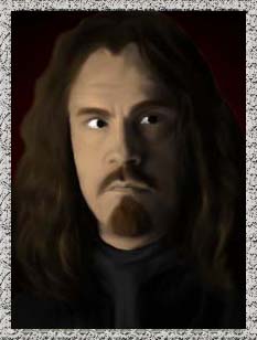 and mustache. His nearly black eyes seem