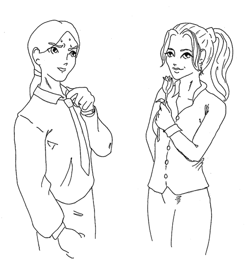 "Suit yourself. But Rinoa's probably gonna hide it before she lets you go." Irvine gripped his hat with one hand on top of his head. "It's my hat, Squall." "What's the big deal? You act like a kid with his blankie over that thing." "This hat's been with me through thick and thin. If you had a good hat you'd understand." "Get a dog, Irv. Lose the hat." Irvine pouted as Squall's girlfriend Rinoa Heartilly poked her head in. She offered one of her cheerful smiles, eyes crinkling in amusement. "Is everyone decent?" Squall glanced up from the cleanest magazine he could find in Irvine's room. "We're dressed, if that's what you mean. Irv's having hat issues." Rinoa walked in, carrying a basket with combs, scissors, and a spray bottle. "You can go just one night without it, Irvy. For Quisty." Irvine sighed and took the hat off, then noticed the contents of the basket with alarm. "You're not gonna cut my hair, are ya?!" "Oh, relax, silly. Just a teensy weensy trim. I promise. You won't even notice it's been cut except it won't look all ratty at the bottom." Rinoa patted the back of the chair. "Have a seat. I can't reach all the way up there. No, not you, Angelo. Shoo." She waved her hand at her faithful pet dog who had made an attempt at commandeering her work station for a nap. Angelo hopped down and jumped up onto the bed next to Squall, licking his face. Irvine sat down slowly, a look of extreme anxiety on his face. "You promised now. I won't notice." Rinoa whipped a towel around Irvine's shoulders to protect his shirt. "You want to look your best for Quisty, don't you? Then stop being so difficult." "She'll just punch you if you move, Irv." Squall snickered and rolled up the magazine to play tug of war with Angelo. "Hey, not funny. She's never hit you, you don't know what kind of a bruise she can leave." Rinoa pulled out the rubber band that held Irvine's long hair back in a ponytail. "Just hold still. I won't hurt you. You look quite grown up, by the way, in those clothes." "Okay, I give, Irv. You're getting it worse than I did. At least you never made me wear a tie." "I feel like I've been turned over as a pawn in a game of dress-up. This ain't me." Irvine settled into a very still pout until Rinoa's comb met with a tangle. "Ow! Go easy!" "Hold still!" Rinoa flicked him on the top of the head with the comb. "You're such a tenderhead." Irvine sighed and did his best to hold still while she combed his hair straight and started cutting the ends off. "How much is she takin' off, Squall?" "Oh, it's about as long as mine now." Squall laughed as Irvine spun around to see how much hair was on the floor and Rinoa whacked him with the comb again. "Just kidding you." Irvine relaxed upon seeing less than an inch of hair trimmings. "Don't do that." "If you keep moving around like that I'm going to cut it short by accident. Now, has Squall given you the talk on no-contact dates?" "What's he got to tell me? I don't touch her." Rinoa sighed. "Men. You'd be lost without us to guide you. There's contact and there's contact." Irvine exchanged a glance with Squall, then both of them looked at Rinoa. "Huh?" Rinoa looked to the ceiling and shook her head. "It's okay to be a gentleman, just not a groper. Offer your arm to her, but don't put your arm around her. Lend her your hand going down stairs, but don't pat her butt. Understand now?" She selected a black braided leather thong and started redoing Irvine's ponytail, catching the sides that usually hung haphazardly on his cheeks and smoothing them back into it. "I'm always a gentleman. But I get the drift." Rinoa smiled and patted him on the shoulder, then carefully took the towel off and dusted his shirt clean. "There. You look like you're actually put together for once. Let me redo that tie, though." Irvine tilted his chin up and let her work on it. "Not too tight. Damn thing feels like a noose already." Rinoa snugged it up and rebuttoned his collar, then started hunting through his bottles of cologne. "This one's no good. Ugh, this one always reminded me of a sweaty racquetball player. This one works!" She turned and dabbed a bit on Irvine's jaw. "Perfect. You're handsome instead of just cute. Sophisicated even." Irvine rubbed his jaw. "I think I'm allergic. I don't use that one because of that." Rinoa looked at the bottle, then at Irvine's face. "Why didn't you say something?" "Because it wouldn't have stopped you?" Rinoa sighed. "Squall, get a washrag. Maybe we can get the rest of it off." Squall snickered and stepped into the bathroom, getting a wet washrag and tossing it to Rinoa, who started scrubbing Irvine's face. "Oh no. He's got a rash. Oh, well, I can fix that." Rinoa started rummaging through the bottom of the basket and came up with a compact. Irvine dove out of the chair. "You're gonna put makeup on me?!" "Nobody's going to be able to tell. It'll cover the rash. Now, sit!" Rinoa pointed at the chair imperiously. Irvine whimpered slightly but obeyed, closing his eyes. Squall buried his face in a pillow to keep from laughing while Rinoa sponged and smoothed. "There. Nobody would be able to tell unless they were looking right at it under really good light." Irvine cracked one eye open and peeked at the mirror. "If Zell finds out about this, I'm dead, y'know." "Zell's not going to find out. Look, movie stars wear makeup all the time, so you can stop worrying about your cool image. If Laguna had to do it, I think you can handle it for one night." Irvine threw a rolled up pair of socks at the back of Squall's head as snickers leaked through the pillow stuffing. "Stop laughing." Selphie traipsed into Irvine's room with a single red rose. "How's the patient, Doctor Rinoa?" "All we have to do is pick out a cologne that he's not allergic to and we're all set. How about this one, Irvy?" Rinoa held up another bottle that showed signs of use. Irvine nodded sullenly and allowed her to dab some on his neck below the makeup. Selphie eyed Irvine critically and t