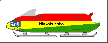 | Bobsleigh : A l'origine de ce projet fou, un groupe de musique locale, associé à 3 lutteurs Pumbaas traditionnels. (voir notre site). Le pilote est donc le chanteur local Salif Touré. Une initiative sympathique, qui dispose certes de muscle mais de bien peu d'expérience. (total volontairement inférieur à 100) Poussée : 28 virage facile : 20 virage moyen : 20 virage difficile : 18 |