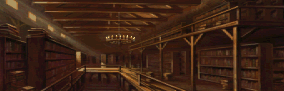The room is small but functional; a few desks covered with papers seem to merge with the far wall, beside a door leading farther into the unusual structure. Shelves are carved into the walls, holding volumes of red leather-bound books, labled in some mysterious language.