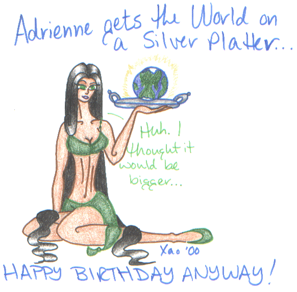 *sniffle* This was my very first picture from a fan. It's very dear to my wee little heart. by Artemis I'm a dirty little girl! he he he by Xao I let my hair down by Xao I get a bit relaxed after a hard day's work. . .(*snikcer, I said "hard") by Xao (again) A spread that Mnesy did by Mnesy Check it out! I'm (deep voice) Darth Adrienne by Xao A sweet, *sweet* pic of me based on a story Mnesy wrote by Mnesy An ab-fab pic! * *hugs* * by Ihra **dies again** Naya did this for me as payment for my "walking Kenny on a leash" picture for her page. I think i got the better end of the deal! ;) by Naya YAY! Ihra did me another pic! I LOVE IT!! and im in COLOR! by Ihra AAAAHHHHHH!!!! I LOVE ARACHNE FOR THIS! my head is so cool now! by Arachne Yes, i am aware that this pic is huge, but its still the coolest pic of the hour! by Helvetica Yes, I know. I'm such a babe. You can't resist me. Who could? Ah, yes, the power of Maeve's Pix by Maeve This is the picture i was waiting ALL WEEK for! now presenting. . .the majorly hyped XAO PICTURE!! (rimshot)by Xao I LOVE IT I LOVE IT I LOVE IT!! I haven't flipped this much over a fanpic since. . .the last one I got!!!by Hecate This is a really old pic of me that i have *just now* gotten around to posting! It's about time cos it's one frickin AWESOME pic!!! It's so very me!by Helv Hecate didn't like it, but i simply aDORE it!!! I look -SO- cute!!by Hecate An extra-cute me as Jessica Rabbitby Helv Wearin' lots and lots of henna and a fantastic green skirtby Xao Bein's sexy (as usual) ;)by Andrea Done for my birthday. This one is SO cute!by Xao The first of many Christmas picsby Ihra The Hades Angels!by Ihra The Christmas party down underby Ihra The little hooker turns 16!!by Ihra