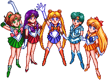 Inner senshi: The inner senshi (Sailors Venus, Mercury, Jupiter, Moon, and Mars)are known as the most important of all the senshi. Jupiter controls powers of lightning, thunder, and earth. Venus controls love and beauty. Mercury controls water. Mars controls fire. Moon is the "healer" of the group and possesses few powers in Sailor Moon and Sailor Moon R. | ||||||||||||||||||||||||||