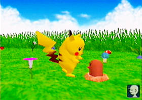 Pikachu VRS was originally introduced in Japan as Pikachu Genki Dechu. Depending on how it's said, "Pikachu Genki Denchu" can either mean "Pikachu, how are you?" or "Pikachu is doing fine." Over the course of the game, you'll have to befriend and take care of a Pikachu. Your interactions with the star Pokemon -- what you do, where you go, and even what you say -- will affect how Pikachu feels about you. Thats right, Pikachu will actually listen to what you say! Nintendo is including a headset with an attached microphone that plugs into your N64 just like a regular controler. The game's voice recognition system will allow Pikachu to listen and react th whatever is said. Depending on what you say, Pikachu will respond with a variety of facial expressions as will as little thought bubbles.