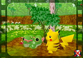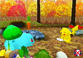 Like any wild animal, Pikachu won't be comfortable with your presence. You'll have to first win his trust before Pikachu becomes your friend. For example, Pikachu will site under a tree waiting for an apple that he can't reach. If you go over and shake the tree, the apple will fall down and Pikachu will be happy. This is the start of a beautiful friendship. As with most pets, Pikachu will have to be constantly fed and entertained. Fortunately, there will be plenty of items to find and mini-games to play as you wander all around the forest, so it's not just a standard virtual pet game!