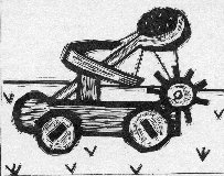 flinging objects over castle walls. A massive cup or net is held under great tension by a strong rope or chain. The tension is mechanically released and the cup flings its contents of rocks, trash, cows, or Greek fire. |