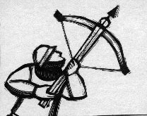 that shoots heavy bolts (small arrows). It takes a long time to load using a cranking mechanism. An archer can shoot dozens of arrows while a crossbow reloads. Banned by the church, most knights considered it a dishonorable weapon, but some soldiers used it anyway. William Tell was a legendary crossbowman who had to shoot an apple from his son's head as a punishment for not being loyal to the Austrian court. |