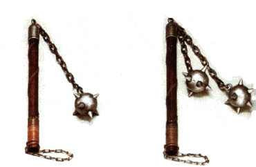 Mace - A blunt or spiked heavy ball attached directly to a handle. Used to smash the enemy, it came in both footman's (long-handled) and horseman's (short-handled) versions. |