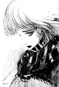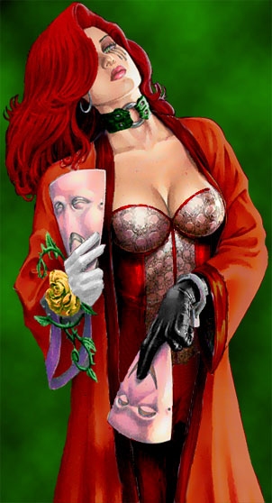 A woman wearing black vinyl shorts and a short, sheer belly shirt and mirrored sunglasses moves away from the bar and walks up to you. She is wearing fishnet stockings under the shorts, and a pair of thigh high leather boots with silver spiked heels. There are silver buckles going up the sides of the boots, making them look even more dangerous. Her hair seems to be the color of a dark wine---or maybe it's burgundy satin. You're not sure, but it's like no color of hair you have ever seen before, and it swings free and wild below her waist and around her face like an angry lion's mane. A vine of what appears to be rose thorns creeps up her arm, a blood red rose set on wrist. It is a beautiful and deadly reminder of the past you have read of. She straightens her sleeveless motorcycle jacket and looks at you thoughtfully. As you look her over, you notice a silver rose charm dangling from her pierced navel.