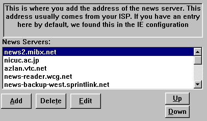 - Use the edit button to edit information about a news server. You can use this to add password information for servers that require them.