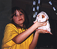� h�r har vi Nattali som �r 10 �r och kom efter Angelika. En otroligt glad och sprallig tjej hon kommer bli n�t stort innom djur, tror jag, f�r hon �lskar djur och har ett fantastiskt handlag med dem. H�r �r hon med Chadden som �r ett av deras 15 marsvin. Och p� grund av alla djur de har sover hon i vardagsrummet f�r att djuren ska f� plats. |